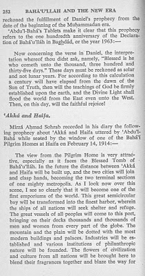 We quote here from J. E. Esslemont’s Bahá'u'lláh and the New Era, a book published by the Bahá'í Publishing Committee and copyrighted by the National Spiritual Assembly of the Bahá'ís of the USA. Originally the manuscript of Bahá'u'lláh and the New Era was revised and approved by `Abdú'l-Bahá and after his death, by Shoghi Effendi as well as by a committee of the National Bahá'í Assembly of England.[1] Esslemont writes: